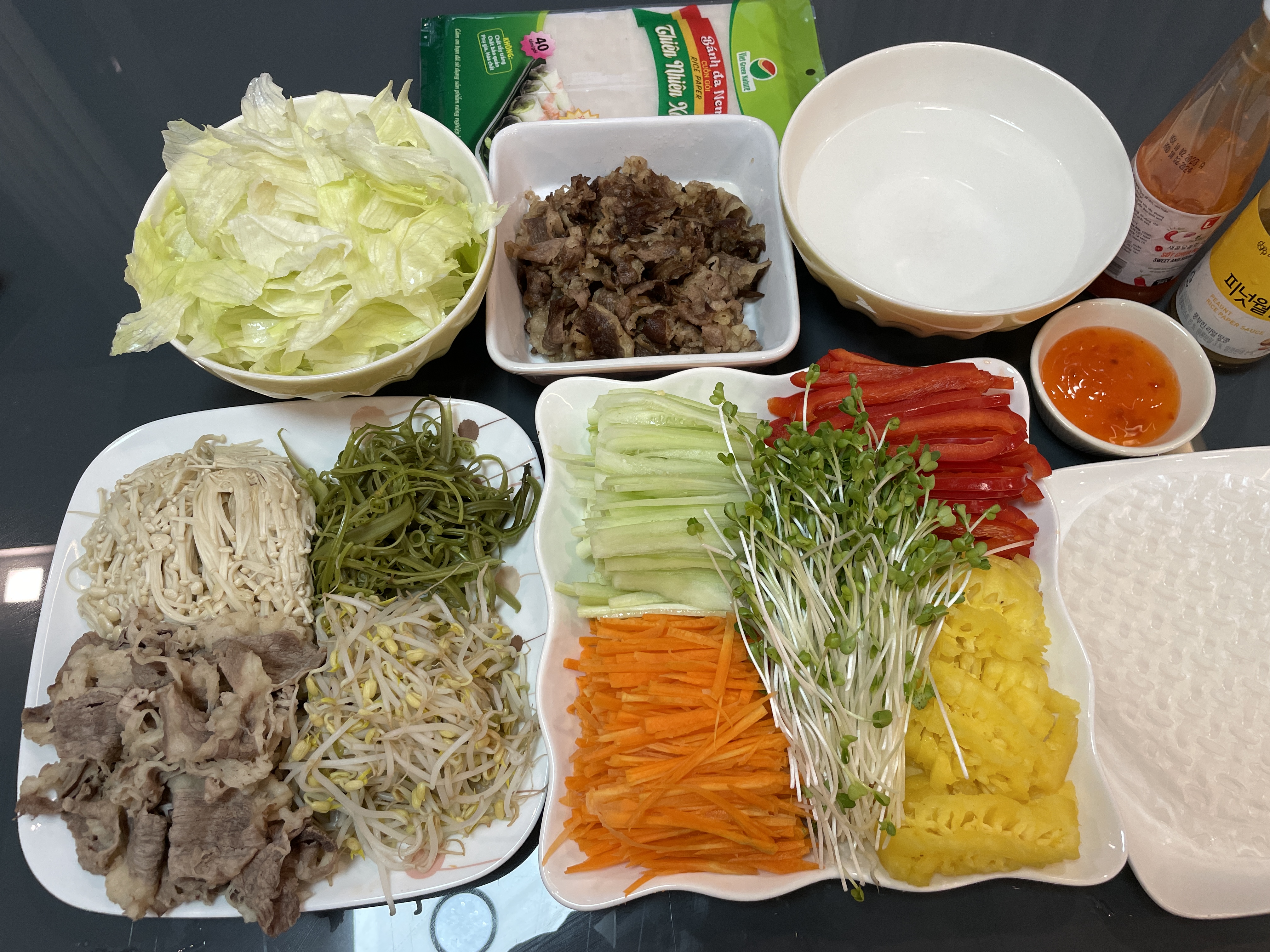 * 한국의 월남쌈 맛이 보고싶어서 직접 장도 보고 파인애플도 깍고 당근채도 썰고 야채도 씻고 데치고 했더니 두시간이 넘어
